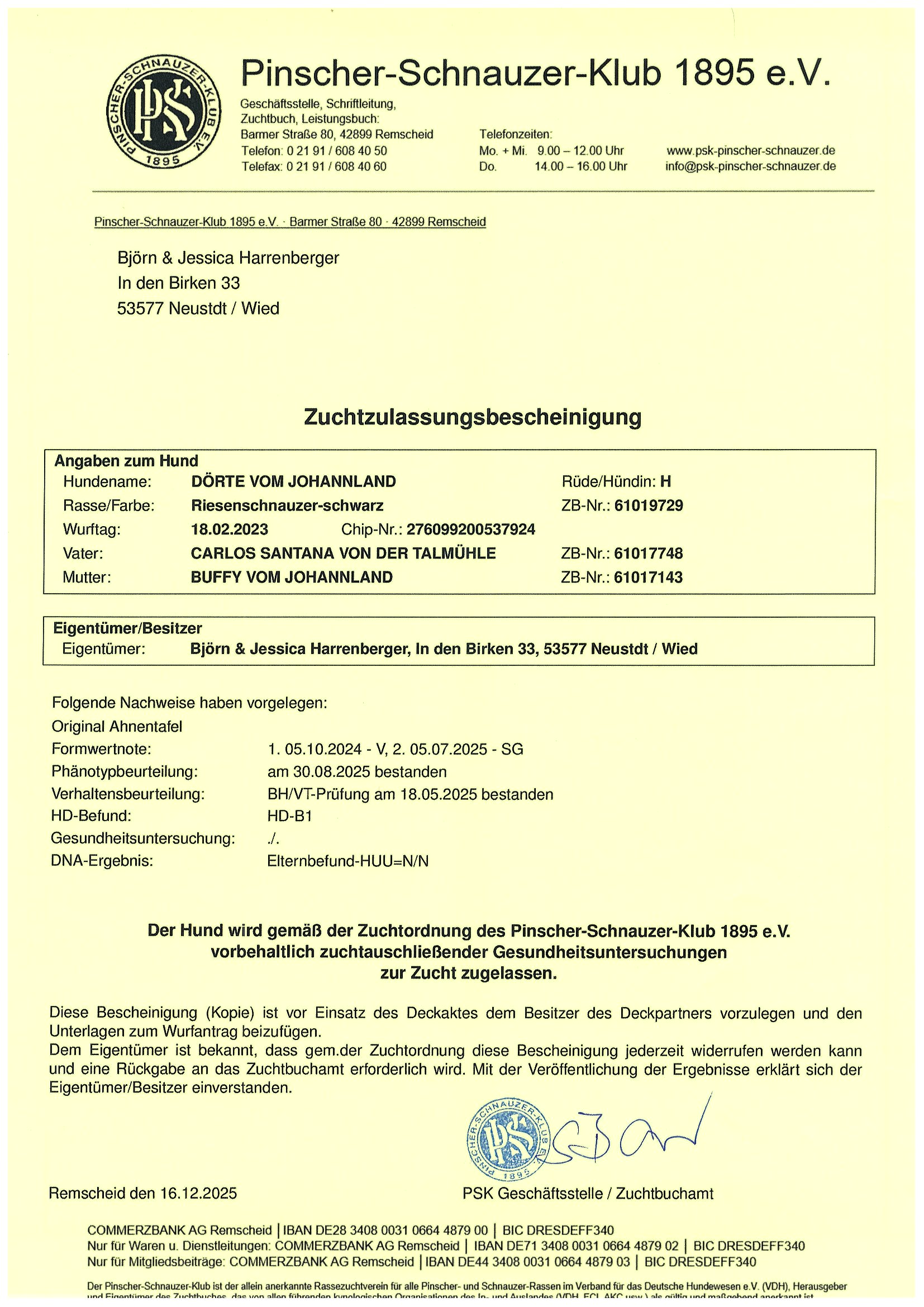 Zuchtzulassung mit Formwert: Sehr Gut